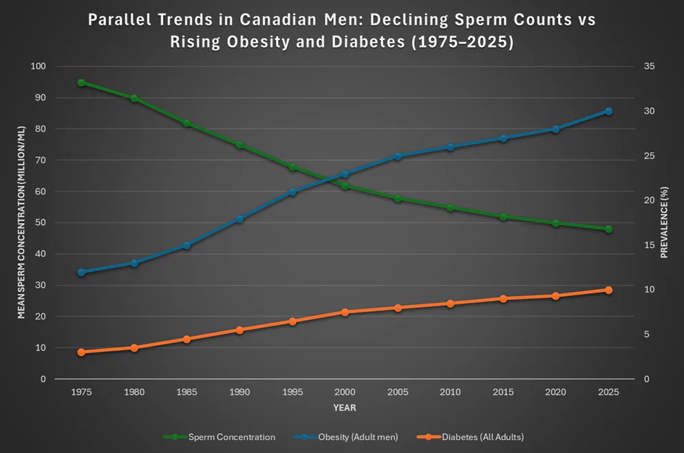 While sperm count has declined globally, other health conditions have also risen in parallel with nearly every country following the same trajectory. Specifically, on a global scale: